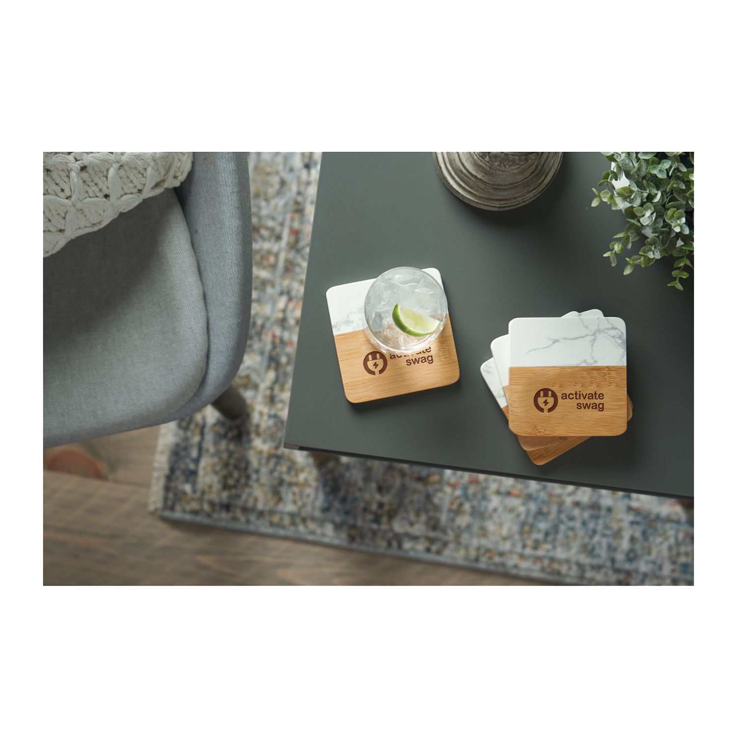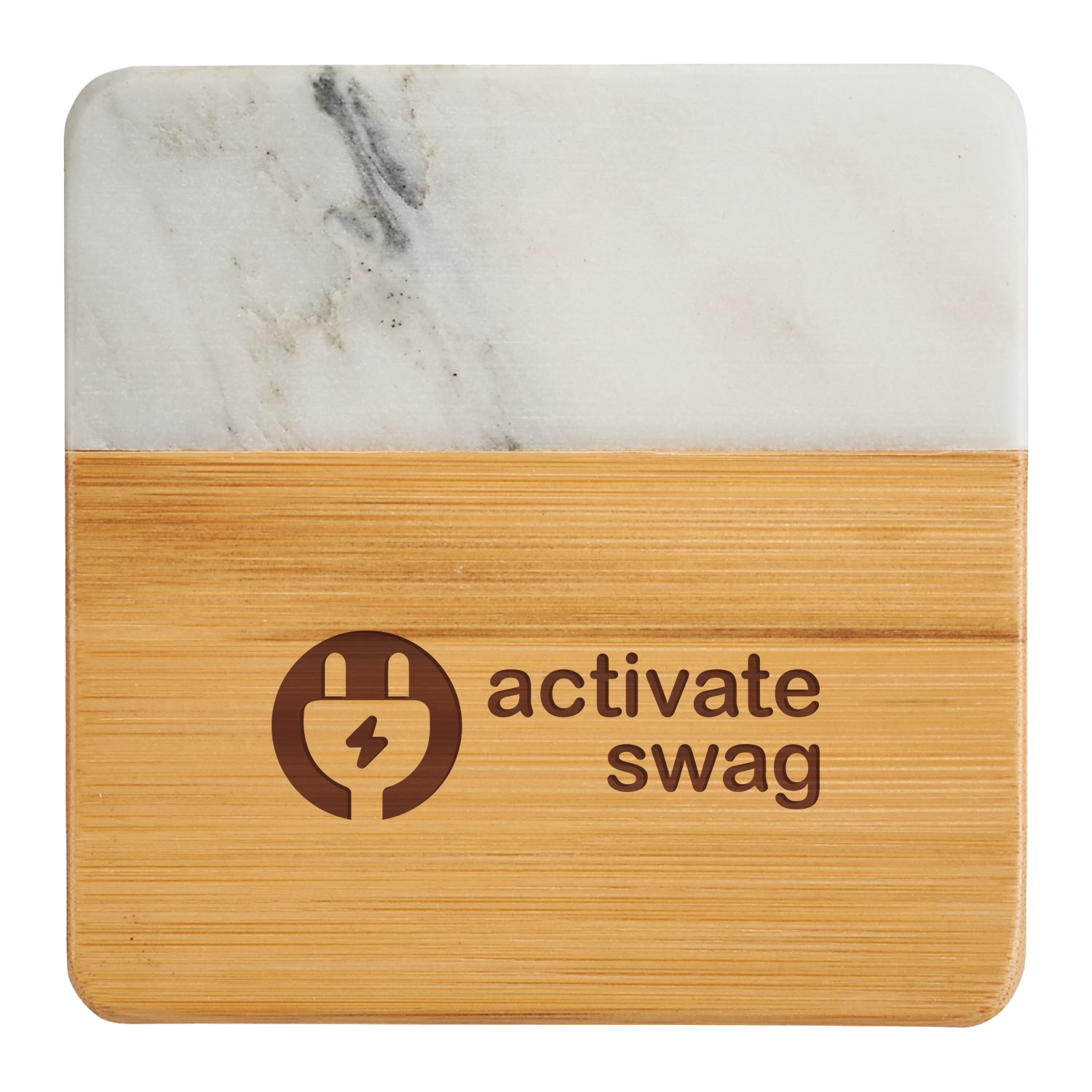 Each item in the four-piece Marble and Bamboo Coaster Set is square with rounded corners, perfect for your coffee table, office desk, or nightstand. Natural variations in the marble give each piece a unique, hand-crafted look, making these coasters truly one-of-a-kind. Due to the nature of the bamboo material, variations in laser imprinting quality may occur.