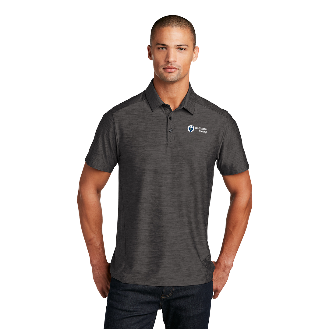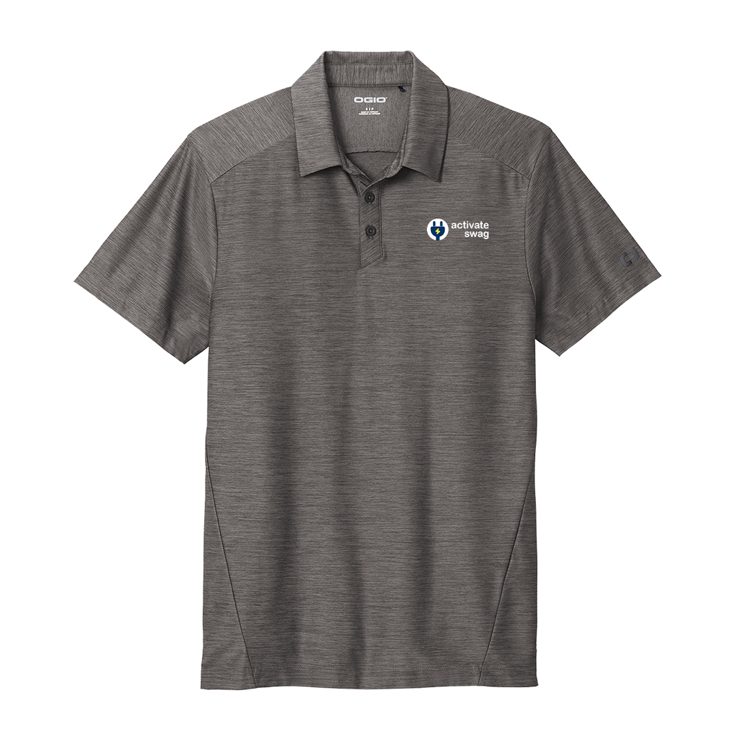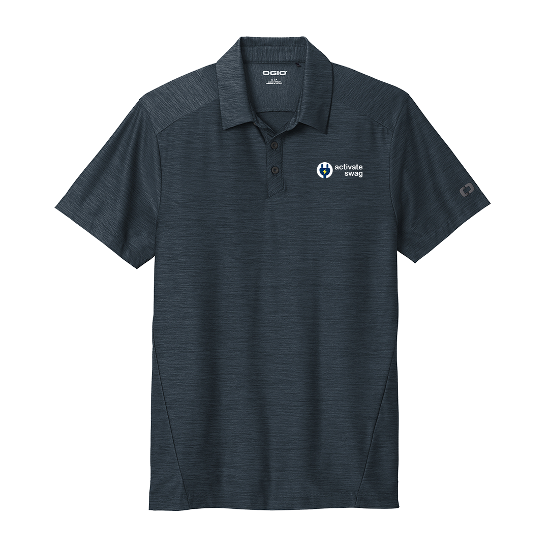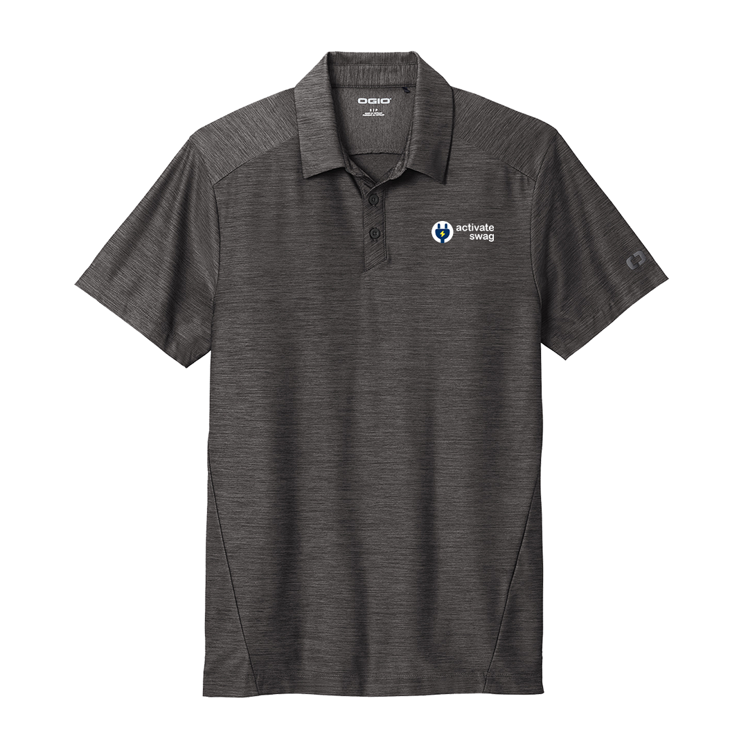 Ogio's Slate Polo is crafted with a tonal heather polo fabric that performs with moisture wicking and stretch. 5.2-ounce, 90/10 poly/spandex with stay-cool wicking technology. OGIO heat transfer label for tag-free comfort. Self-fabric collar with collar stand. OGIO woven tab at center back collar. Angled 3-button placket with flat matte black silicone buttons. Forward side seams. Set-in, open hem sleeves. Black reflective O on left sleeve.