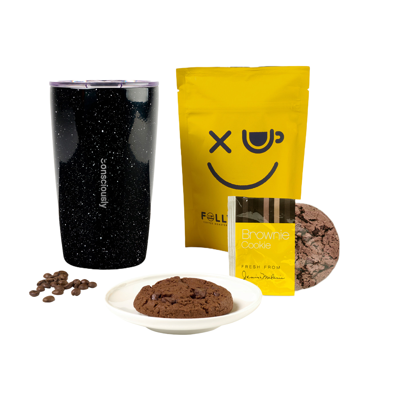 Includes: Folly Classic Jo Coffee Beans 4oz, J&M brownie soft baked cookie 1oz, and a 12 oz Arlo Tumbler.
