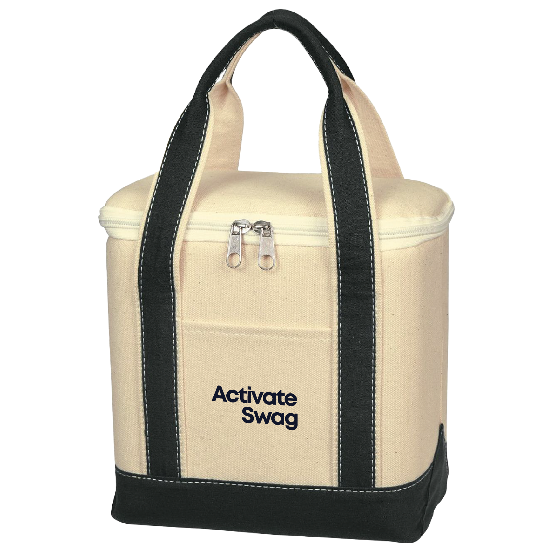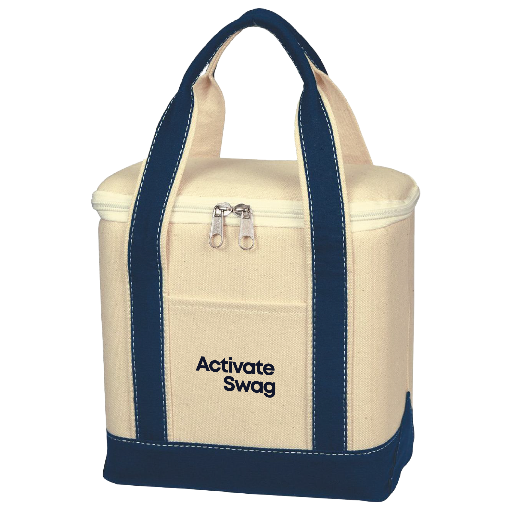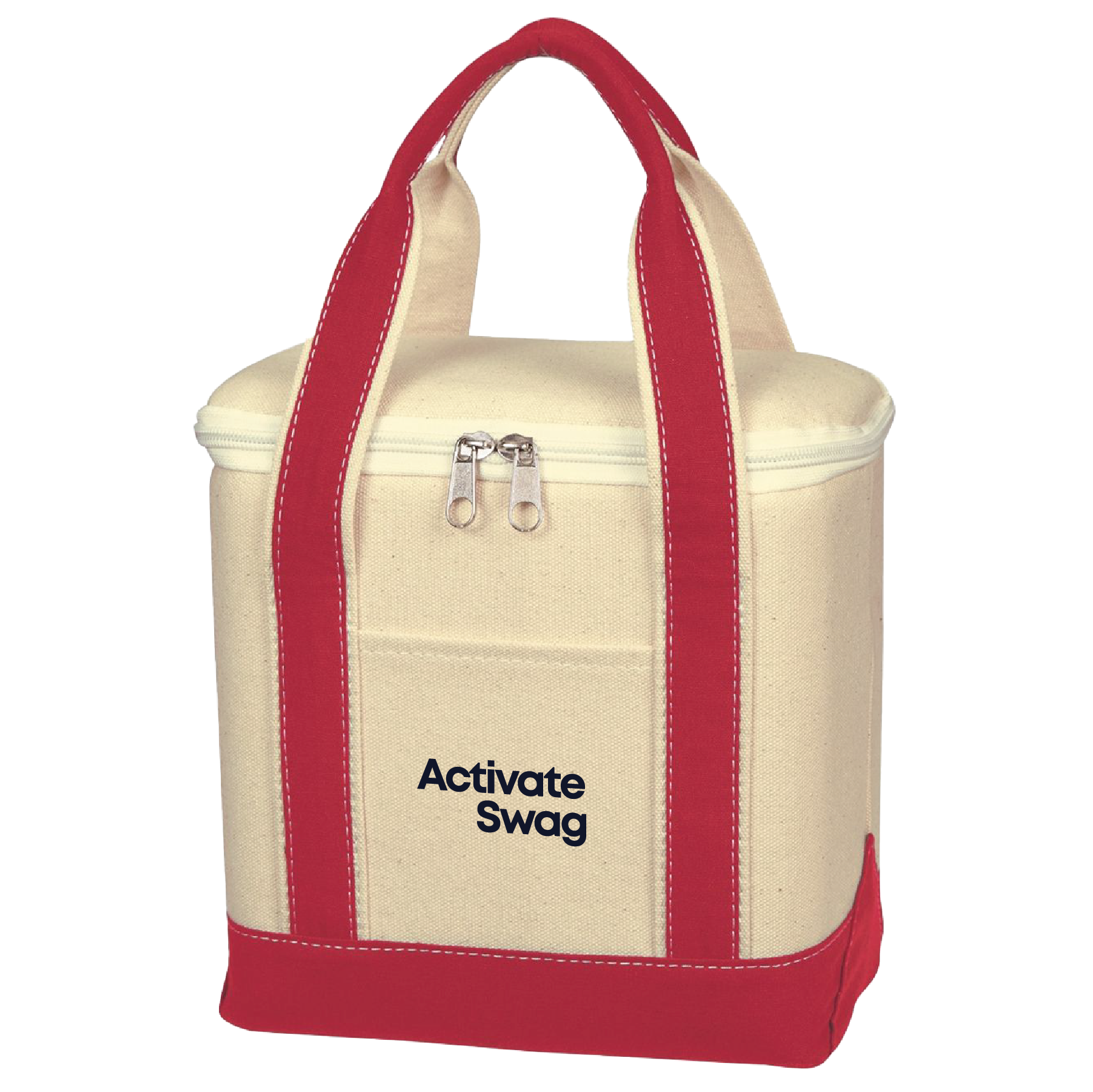 This small cotton canvas kooler bag is perfect for the beach or tailgating parties! Made of 16 oz. canvas with PEVA lining, this compact bag features a zippered top closure, two interior mesh pockets, a front pocket and 16" straps. Measuring approximately 10" W x 8" H x 5 1/2" D, it's about the size of a six pack. Choose from several accent colors and customize this natural colored cooler tote with an imprint of your company name or logo. Spot clean/air dry for best results.