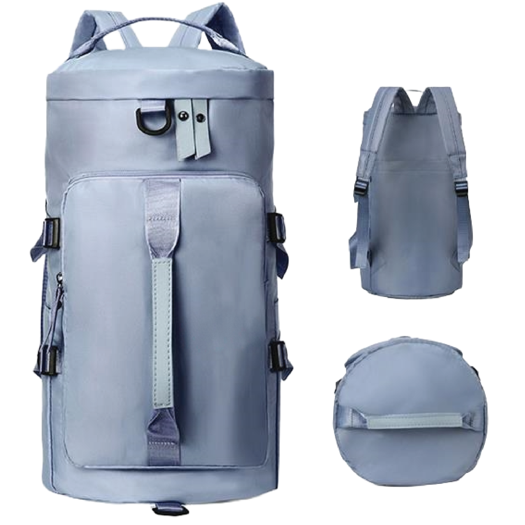 Convertible Backpack Duffel.The Sports Duffle Bag can be worn as a backpack thanks to the dual adjustable padded backpack straps hidden in the side zipper pocket, with 1 sternum strap for comfort even when loaded heavily. Also equipped with 2 long haul handles and 4 grab handles for multiple carrying ways.Large Capacity Duffle Bag Measuring 25.6"L X 13.4"W X 10.6"H with 60L Capacity, enough room for your sports gears and traveling necessities.Durable Water-resistant Sports Bag.Made of heavy duty tear & water-resistant tarpaulin with strong double bottom and reinforced stitches to provide long-lasting durability against daily activities.